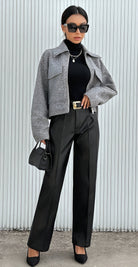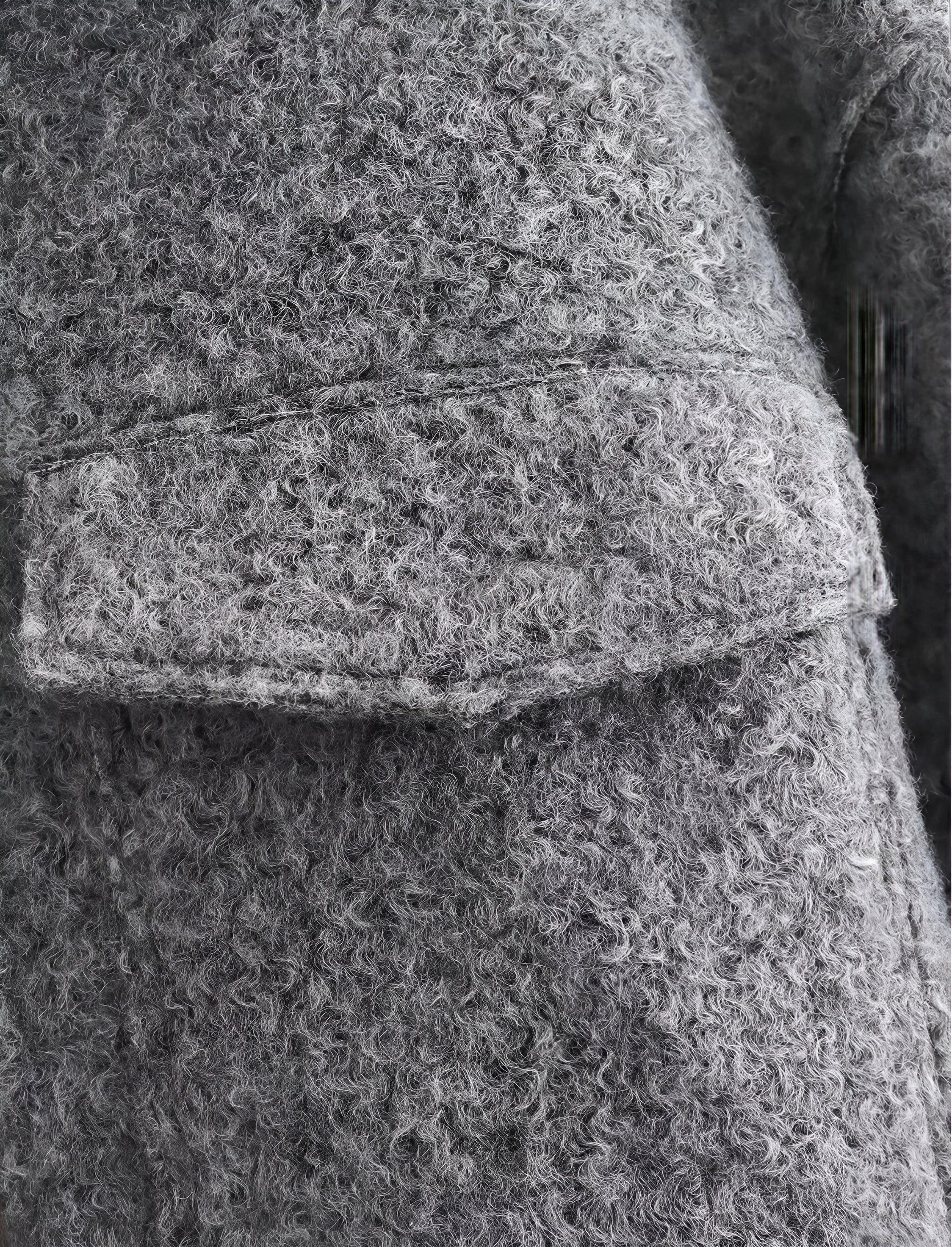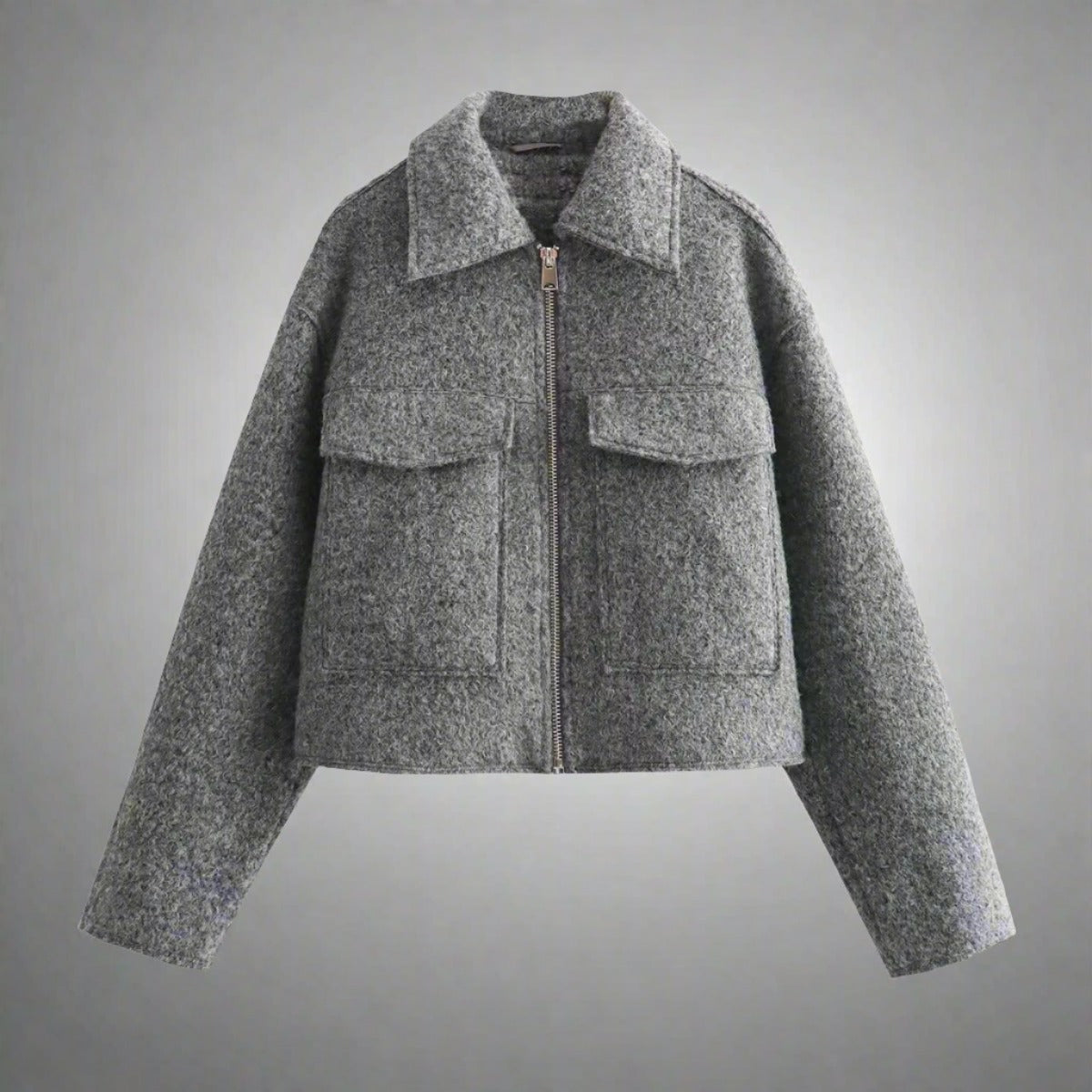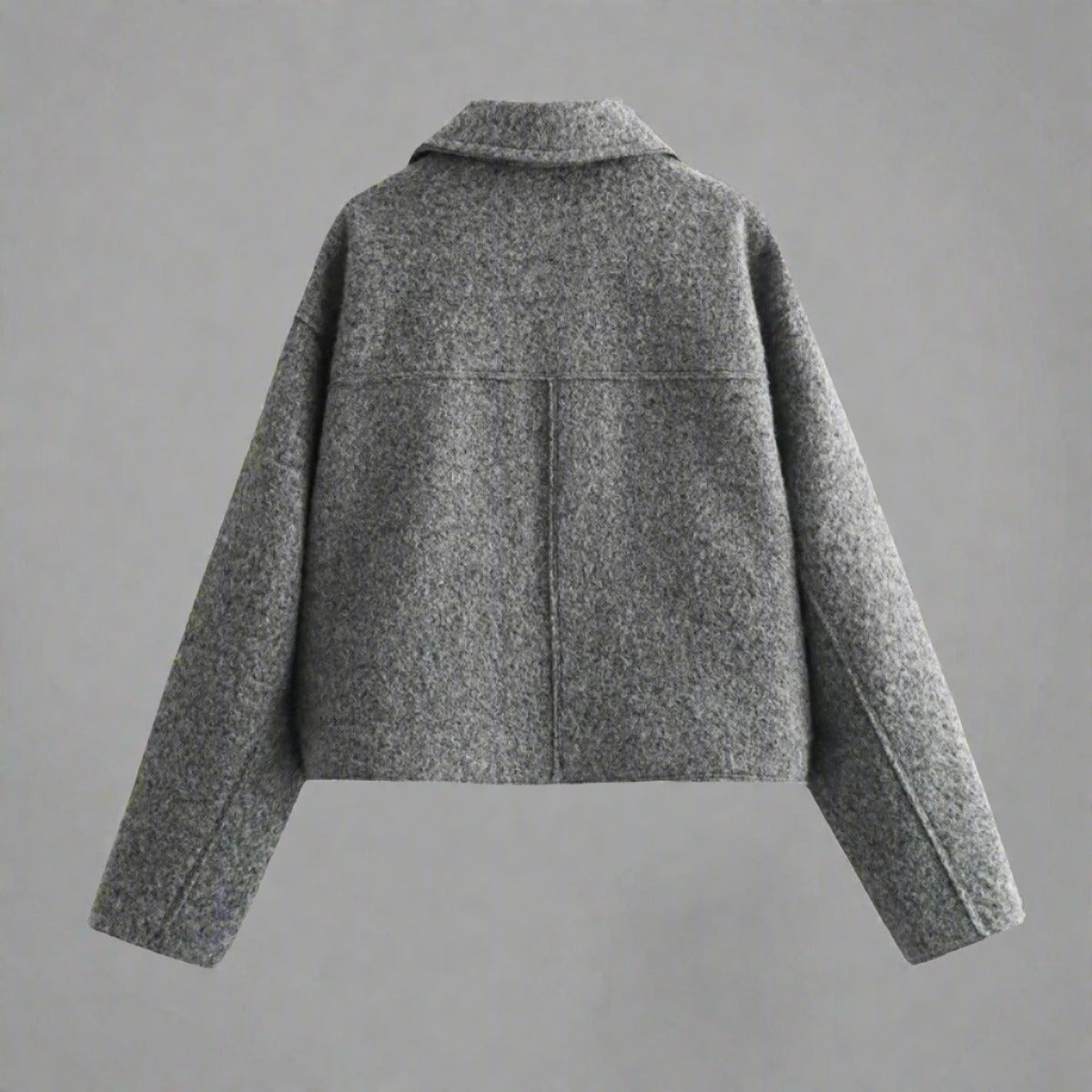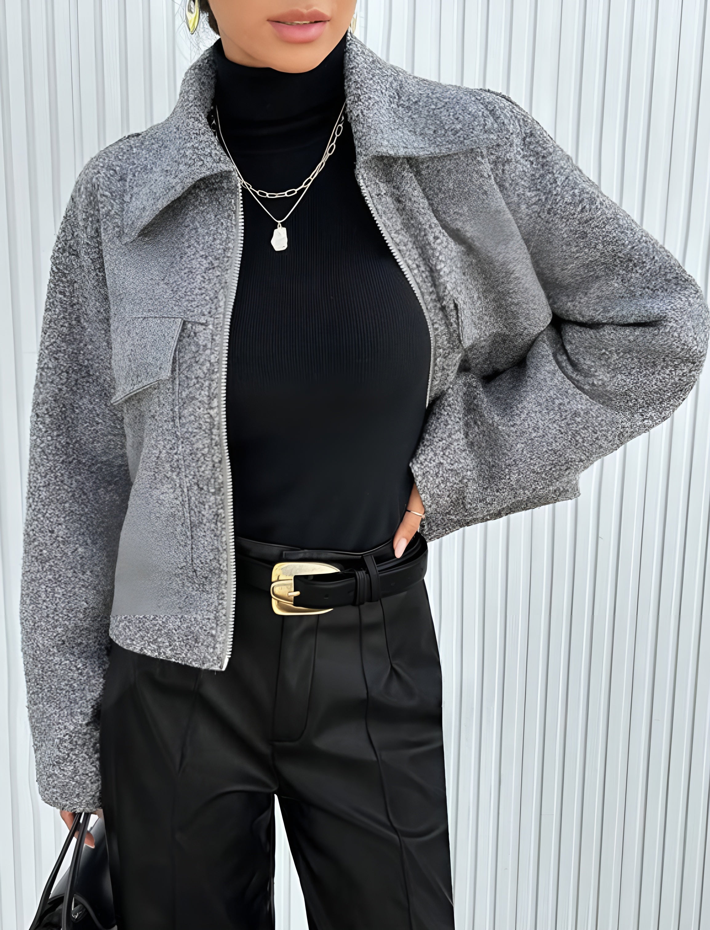 La veste Élina combine une coupe courte structurée avec une matière effet laine douce et élégante. Pratique et tendance, elle se porte aussi bien avec un pantalon habillé qu’avec une tenue plus casual.