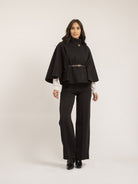La cape Nora offre une silhouette fluide et moderne grâce à sa coupe ample et ses manches évasées. Sa ceinture fine structure l'ensemble tout en laissant une grande liberté de mouvement. Un choix idéal pour une tenue soignée et confortable.