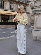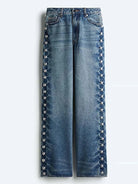 Le jean Lina modernise une coupe droite classique avec une rangée de boutons décoratifs sur le côté. Disponible en bleu ou en blanc, il offre une silhouette nette et un style affirmé, idéal pour un usage quotidien ou urbain.