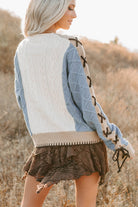 Le pull Elsa se distingue par ses manches contrastées en maille torsadée et ses liens décoratifs. Une pièce confortable au style champêtre, idéale pour les saisons fraîches.