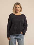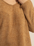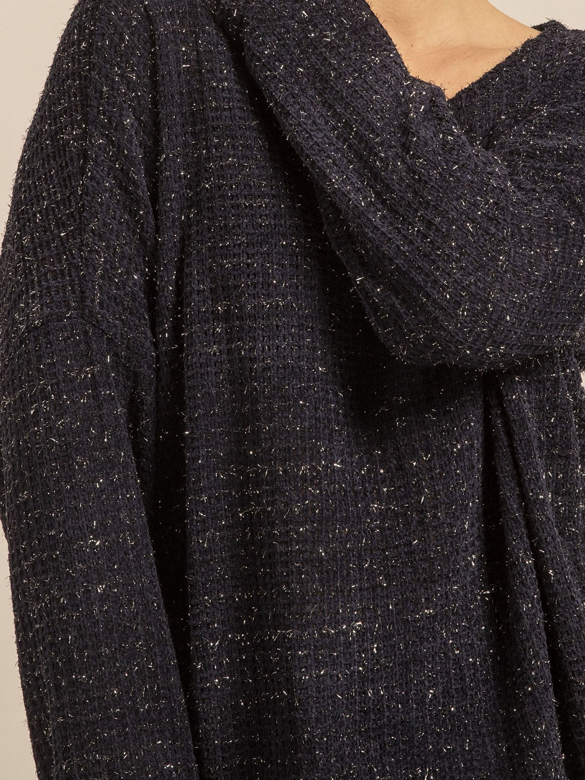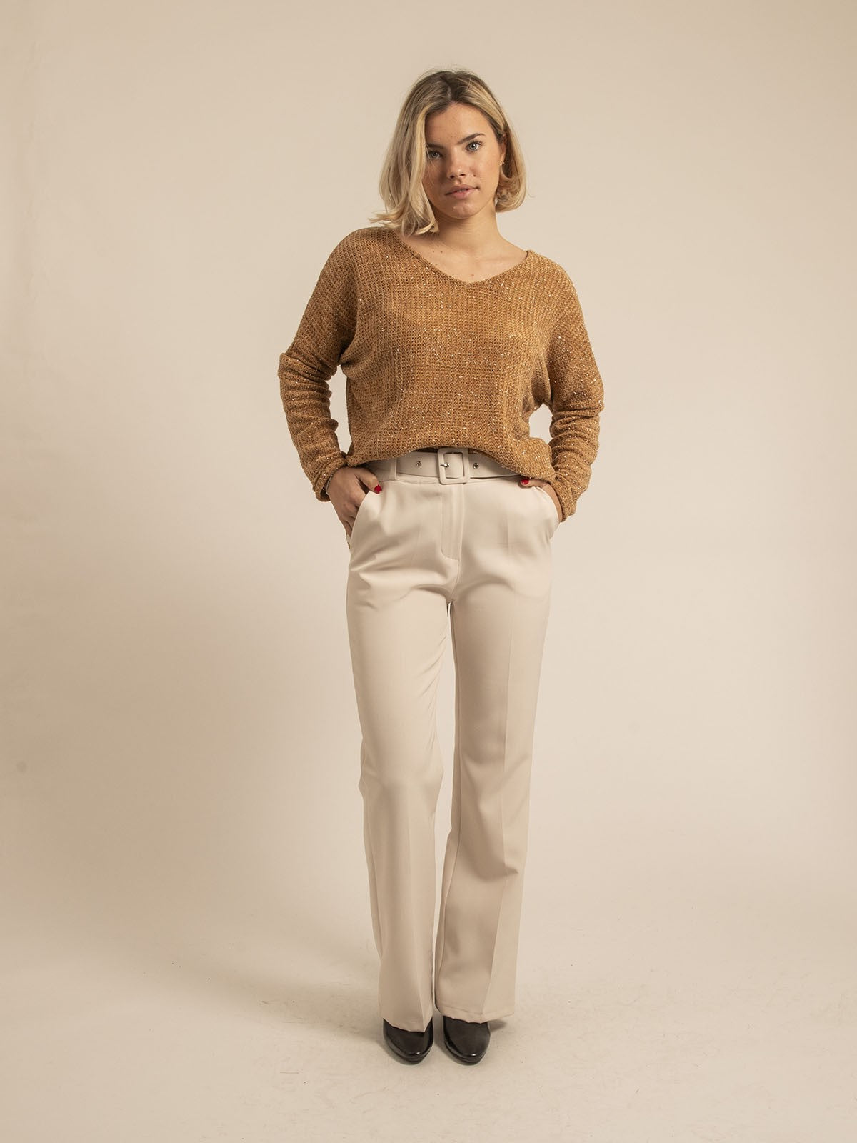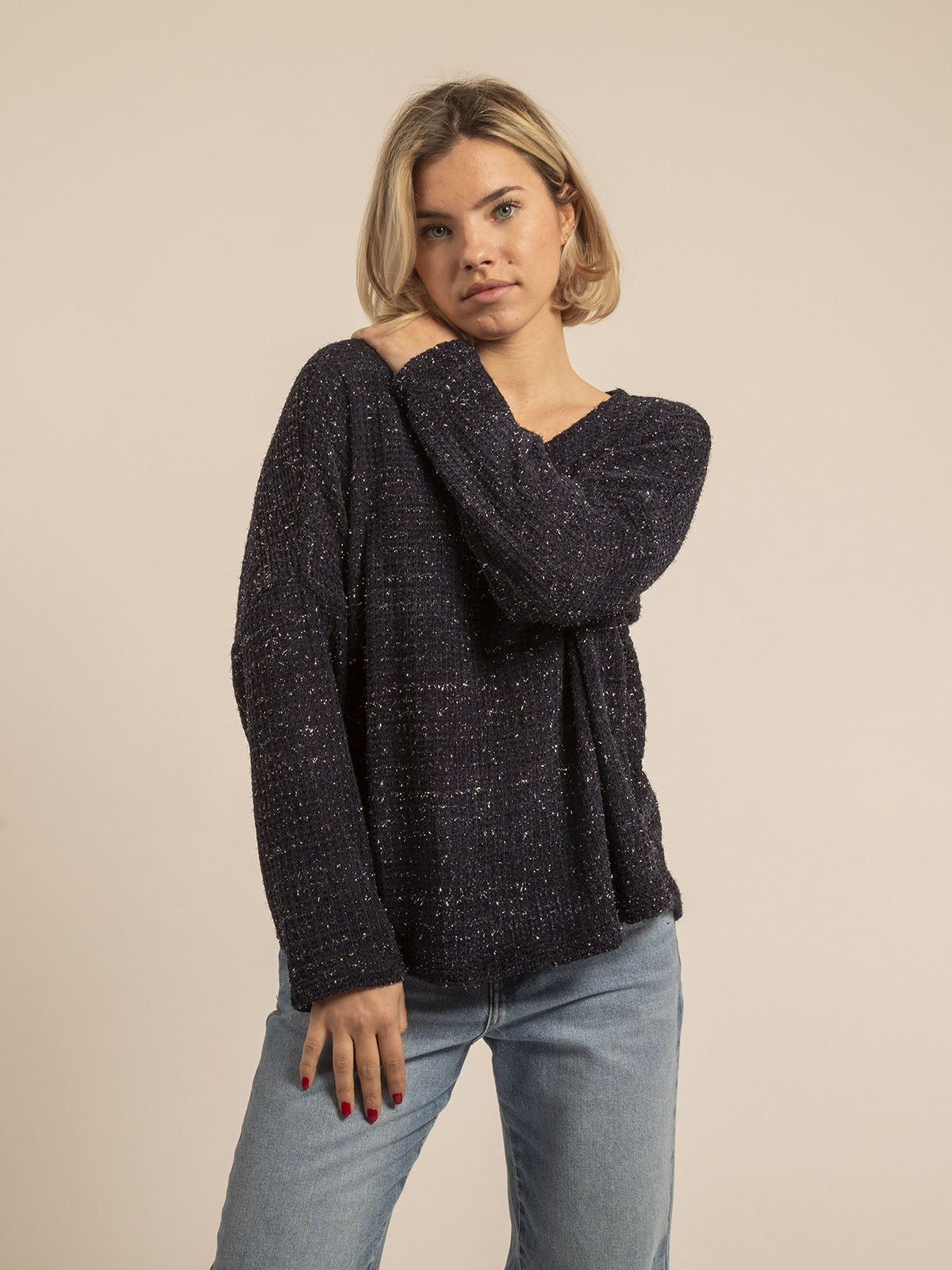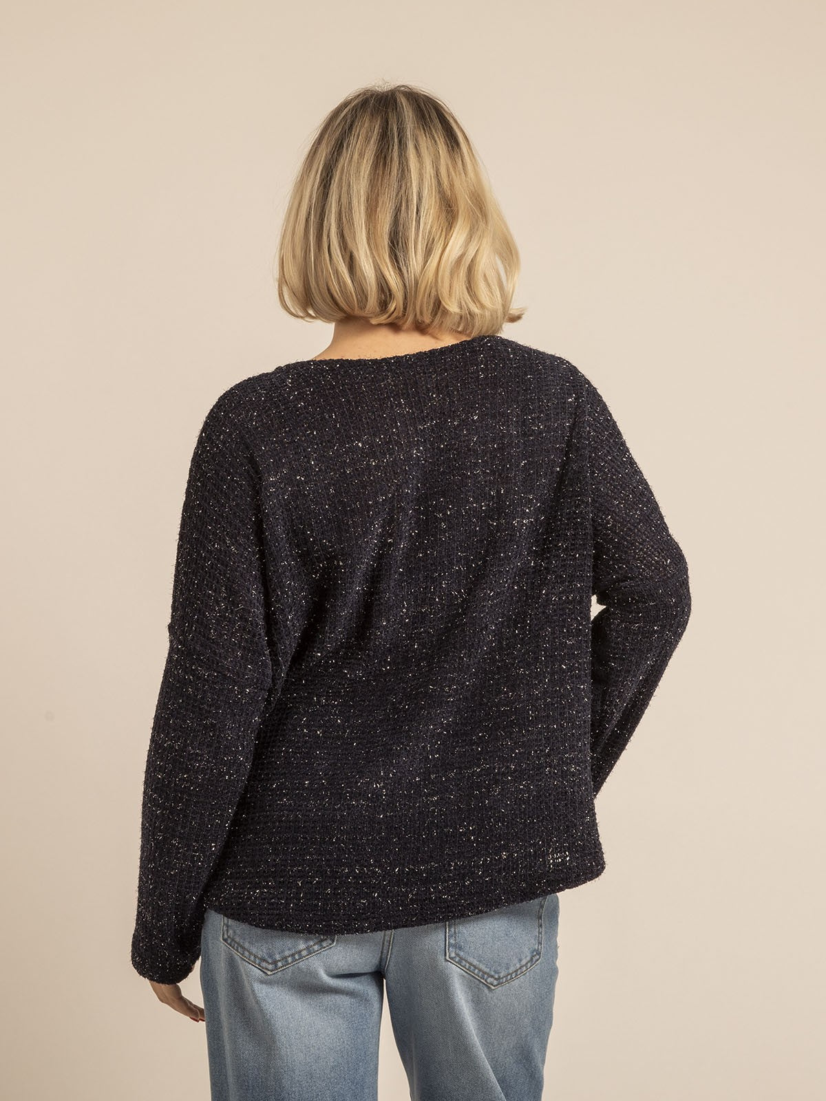 Le pull Lina séduit par sa maille souple rehaussée de fils métallisés discrets. Avec son col en V et sa coupe fluide, il se porte facilement pour un look à la fois simple et lumineux.