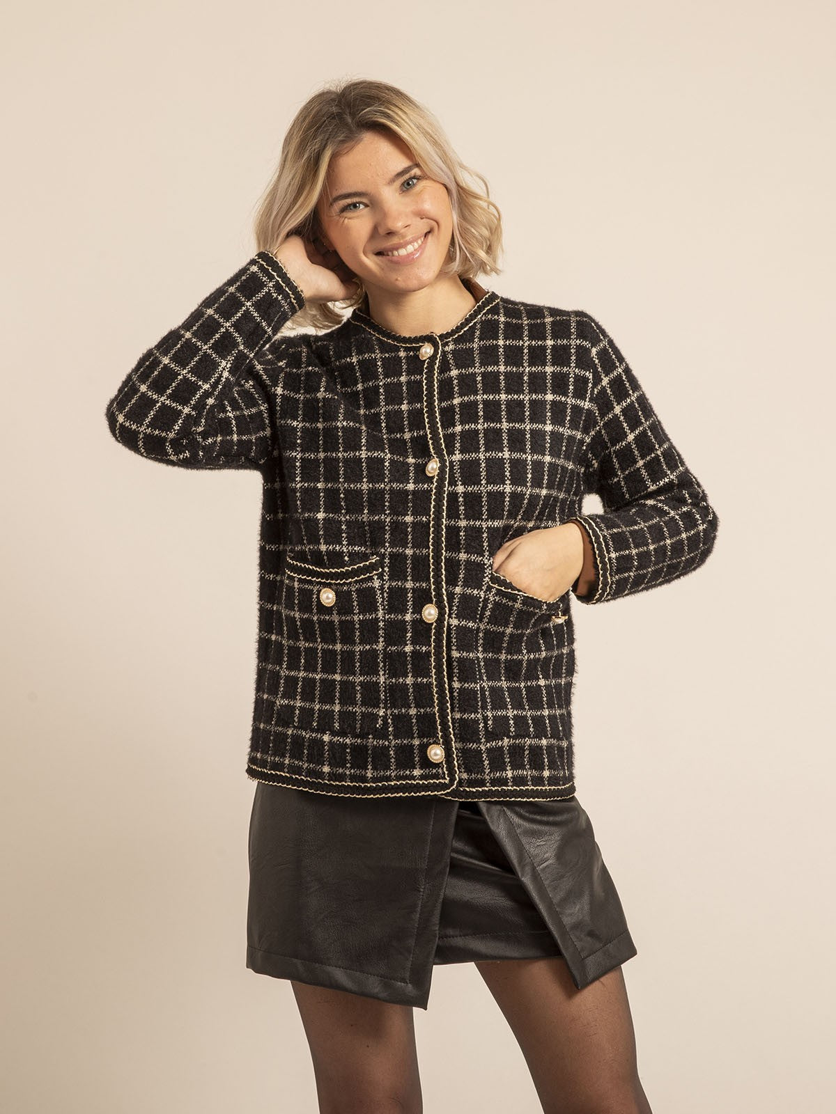 La veste Inès revisite le style classique du tweed avec un motif à carreaux intemporel et une coupe droite moderne. Une pièce chic et facile à porter pour rehausser toutes vos tenues du quotidien.