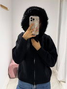 La veste Maïa associe confort et style grâce à sa capuche ornée de fausse fourrure. Sa coupe ajustée et sa maille épaisse en font une pièce idéale pour les journées fraîches, à porter aussi bien en intérieur qu’en extérieur