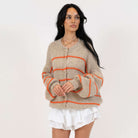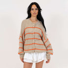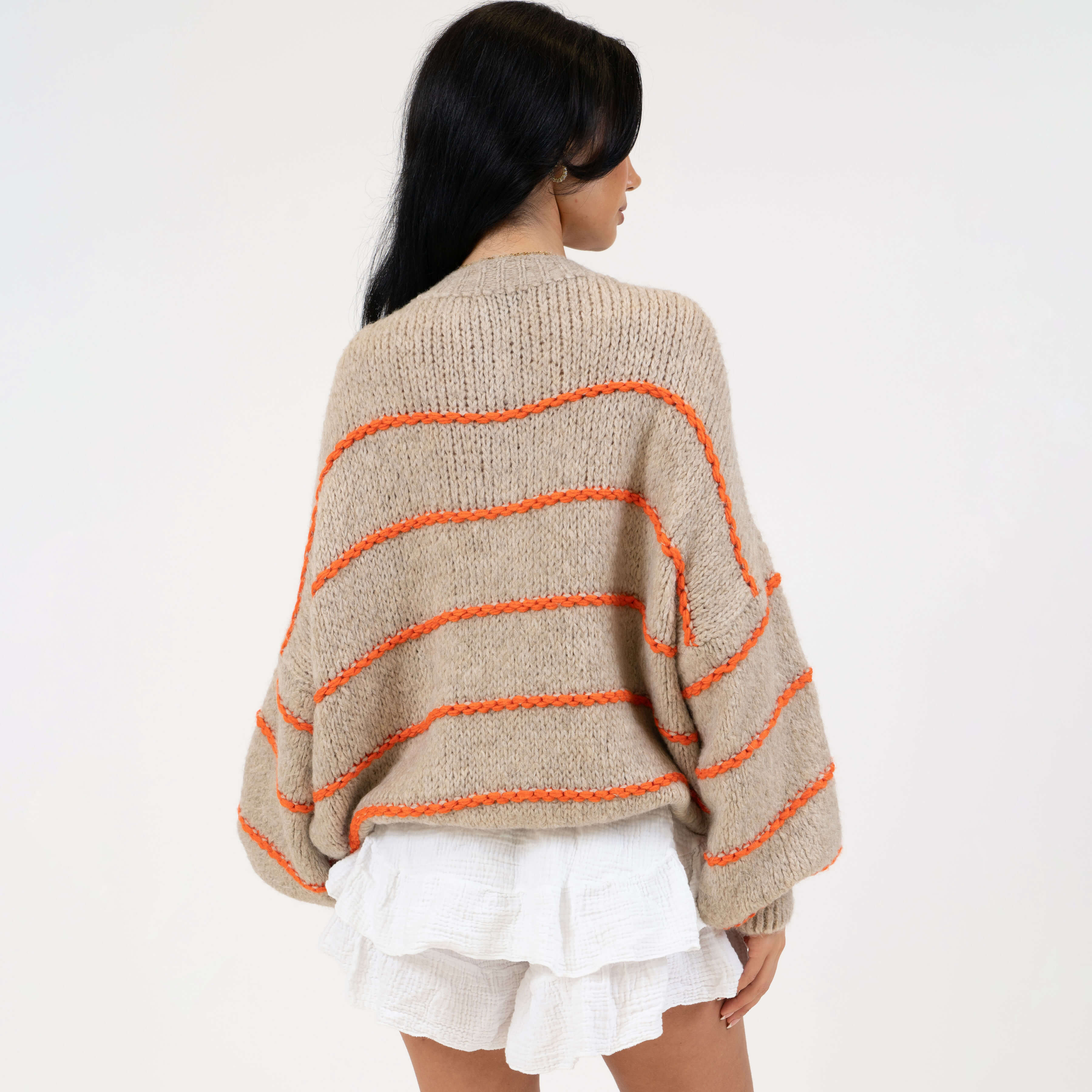 Le gilet Noa allie douceur et originalité avec sa maille généreuse et ses rayures contrastantes. Sa coupe oversize et ses manches larges en font une pièce parfaite pour les tenues décontractées et stylées du quotidien.